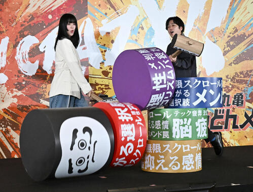丸亀製麺新商品発表会でダルマを崩す二宮和也と池田エライザ(撮影・千葉一成)
