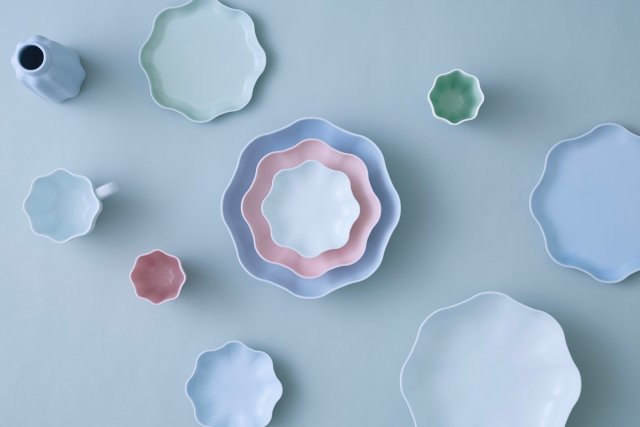 アイテムは、CFCLの定番「POTTERY SKIRT」をモチーフに製作。外側にブラスト加工を施したマットな質感で、原料は天草陶石を採用。電子レンジや食洗機に対応したフラワーベース、ボウル ミディアム、プレート ミディアム、マグカップなど8型を揃える。カラーはそれぞれCFCL WHITE、CLEARLY AQUA、OPALIN BLUE、LAVENDER FROST、EGGSHELL PINKの5色を用意し、価格帯は4400〜9900円。