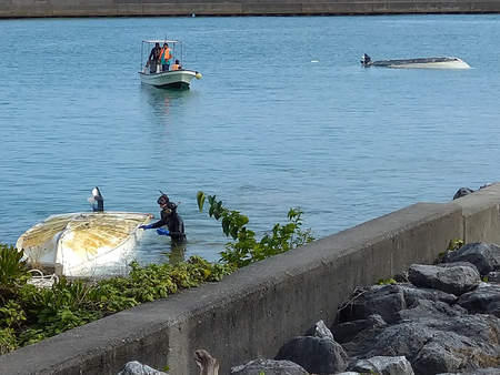 辺野古沖で船2隻が転覆し2人が死亡した事故で、岸壁近くまでえい航された2隻の船=3月16日、沖縄県名護市
