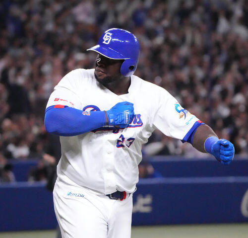 両チーム無得点の5回1死一塁。サノーは巨人先発則本の甘いスライダーを完璧に捉え、左中間スタンド中段へ特大2ランを放った。高々と舞い上がった打球は美しい放物線を描き、ダイヤモンドを回ったサノーはホーム付近で「ゴリラパフォーマンス」を披露。ベンチでも胸をたたき、出迎えたナインも大喜びだった。