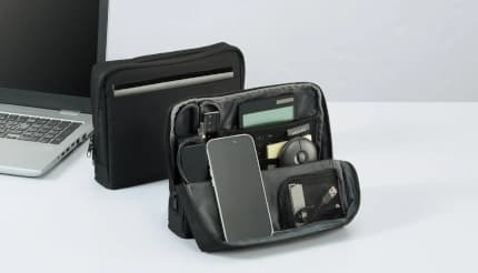 内部には、マウスやACアダプターなどのガジェット類を収納できる広めのスペースと、ペンやイヤホン、小物類を整理しやすい六つのポケット・仕切りを搭載。ワークツール一式を「見える化」しながら整理できるため、必要なものをすぐ取り出せる。前面スペースにはスマートフォンを立てかけることもでき、作業中の通知確認にも便利だ。