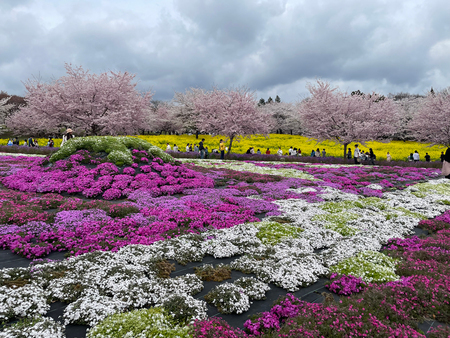 「赤城南面千本桜まつり」で風景を撮影する来場者=5日、前橋市 前橋市で開催中の「赤城南面千本桜まつり」の桜が、見ごろを迎えている。南北に伸びた桜並木に隣接する、みやぎ千本桜の森公園では、桜のほかにも菜の花や芝桜が咲き誇り、観光客の目を楽しませている。