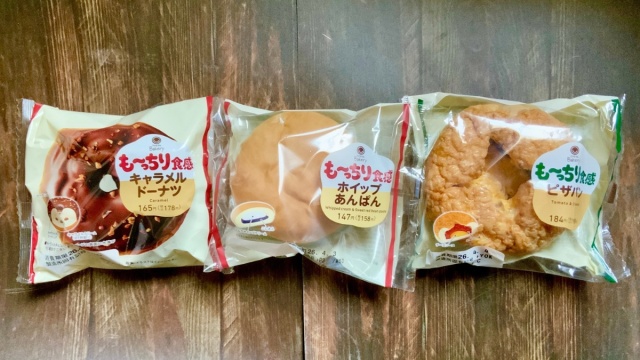 編集部に届いたのは「キャラメルドーナツ」「ホイップあんぱん」「ピザパン」の3種です。