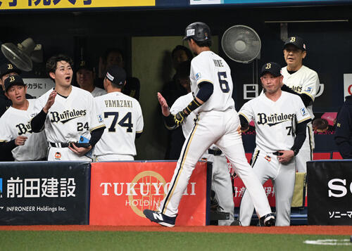 オリックス対ロッテ 5回裏オリックス2死一、三塁、相手捕逸で生還した宗(手前)を迎える岸田監督(撮影・和賀正仁)