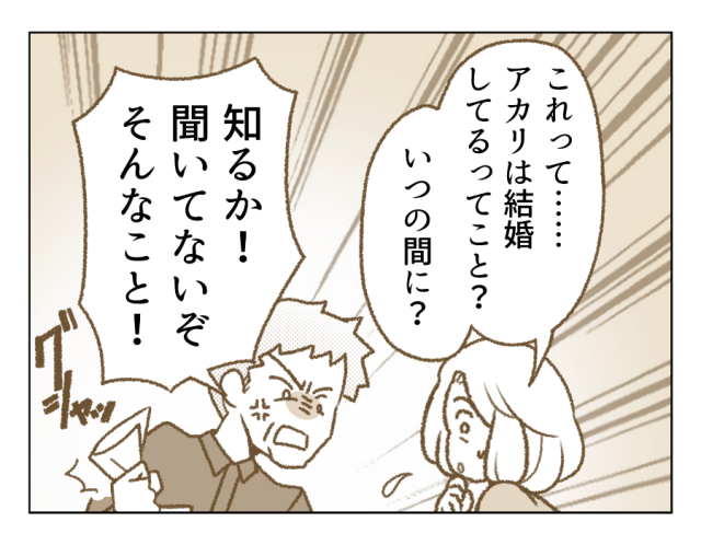 いきなりアポなしで行くかーー? そこまで執拗にアカリさんを追いかける理由は、結婚相手を見ておきたい、ではないですよね……。初めて会うアカリさんの旦那さんらしき人物に、思わずたじろいでしまうヒデキさん。やっぱり自分よりも弱い立場の人にだけ大きく出る性格なのでしょう。その男性の後ろからする女性の声。久しぶりに聞いたこの声はもしかして……? 両親の期待は膨らみます!