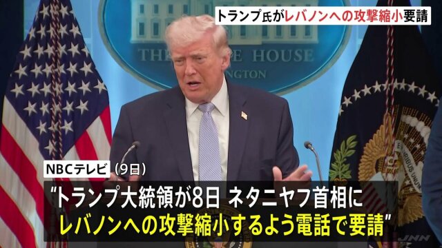 こうしたなか、アメリカのNBCテレビは9日、政府関係者の話として、トランプ大統領が8日、イスラエルのネタニヤフ首相にレバノンへの攻撃を縮小するよう電話で要請したと報じました。