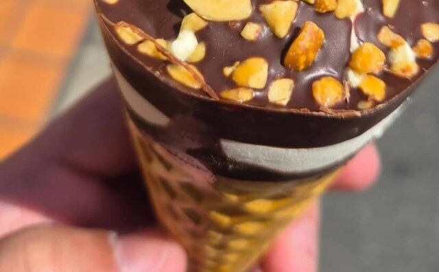 ジャイアントコーンのチョコの上から“ひよこみたいなやつ”が飛び出していました! これは、偶然チョコレートコーティングを突き破って飛び出たアイスクリーム部分に、ひよこの目のようなチョコとくちばしのようなナッツがついたものです。偶然が偶然を呼んで、どう見てもジャイアントコーンからひよこがにょきっと飛び出ているように見えます! 最初から“ひよこ付きジャイアントコーン”と言われたら信じるほど完成度が高い偶然の産物です。