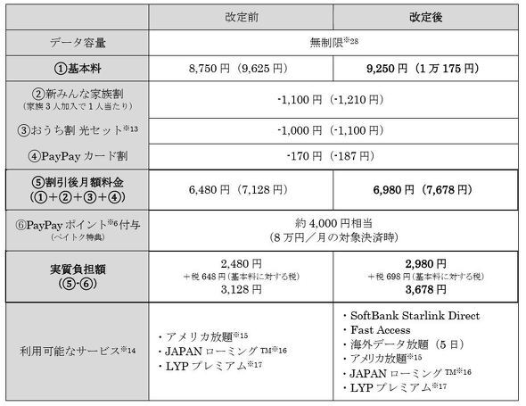 ¡¡¥½¥Õ¥È¥Ð¥ó¥¯¥Ö¥é¥ó¥É¤Ç¤Ï¡¢¥Ú¥¤¥È¥¯ÌµÀ©¸Â¤Ê¤É¤Î¼çÍ×¥×¥é¥ó¤ò·î³Û550±ßÃ;夲¤¹¤ë¡£°ìÊý¤Ç¡¢²þÄê¸å¤Ï¡ÖSoftBank Starlink Direct¡×¤äÄãÃÙ±äÄÌ¿®¡ÖFast Access¡×¤Ê¤É¤Î¿·¥µ¡¼¥Ó¥¹¤òÍøÍѲÄǽ¤Ë¤¹¤ë¡£Î㤨¤Ð¡¢¥Ú¥¤¥È¥¯ÌµÀ©¸Â¤Î´ðËÜÎÁ¶â¤Ï9625±ß¤«¤é1Ëü175±ß¤Ø¤È°ú¤¾å¤¬¤ë¡£