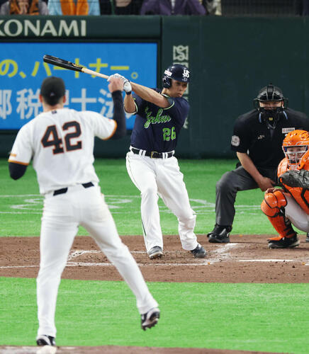 巨人対ヤクルト 4回表ヤクルト1死二塁、安打を放つ山野。投手はマタ(撮影・増田悦実)
