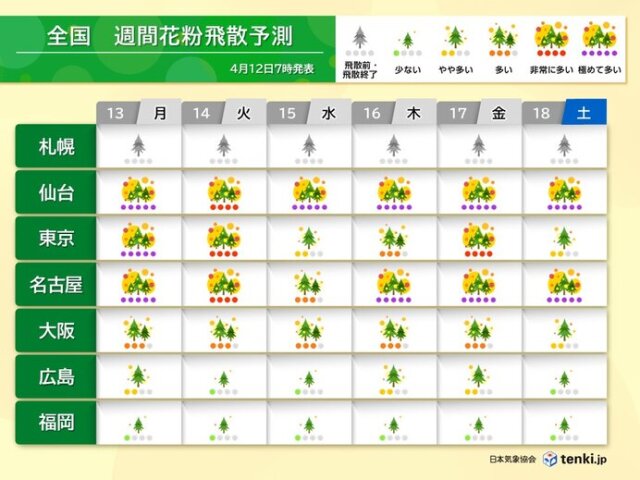 明日13日(月)は近畿〜東北は晴れて、花粉は東海〜東北で「極めて多い」でしょう。ただ、ピークアウトは目前です。東京は今シーズンの飛散量の9割がすでに飛散しています。名古屋や東京(ヒノキ)、仙台(スギ)では、今週を乗り切れば飛散量は次第に減少し、終息に向かう見込みです。ピークを過ぎても、大型連休頃までは例年同様、花粉の飛ぶ所があるため対策をとると良いでしょう。