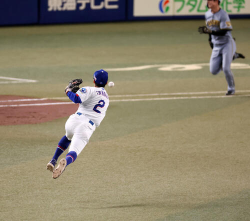 4回無死では森下翔太外野手(25)がライナー性の打球を二遊間に飛ばしたが、今度は二塁手の中日田中幹也内野手(25)がジャンピングキャッチ。中日二遊間のスーパープレーにバンテリンドームは拍手が沸き起こった。