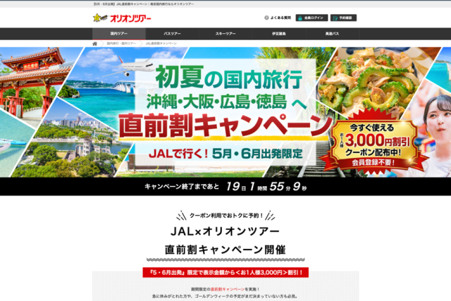 オリオンツアーは、「JAL直前割キャンペーン」を4月9日午前11時から30日午後11時半まで開催する。