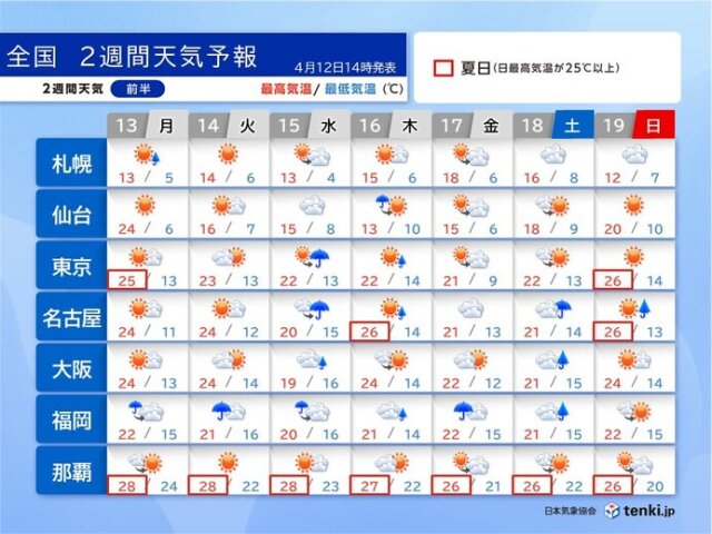 曇りや雨でも気温は各地で平年より高く、東京都心は明日13日(月)と19日(日)に最高気温25℃以上の夏日予想です。19日(日)は、900地点あまりある全国アメダスの内、120地点以上で夏日の予想です。4月11日(土)は、静岡で30.3℃と今年本州で初めて真夏日を観測し、東京都心も27.3℃と今年初の夏日となりました。11日(土)は全国156地点で夏日となりましたが(南鳥島除く)、19日(日)はこの日に迫る暑さとなりそうです。