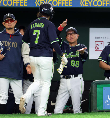 巨人対ヤクルト 3回表ヤクルト1死二、三塁、オスナのゴロで先制点を奪い、生還した長岡(手前)を笑顔で迎える池山監督(撮影・浅見桂子)<巨人0−2ヤクルト>◇12日◇東京ドーム