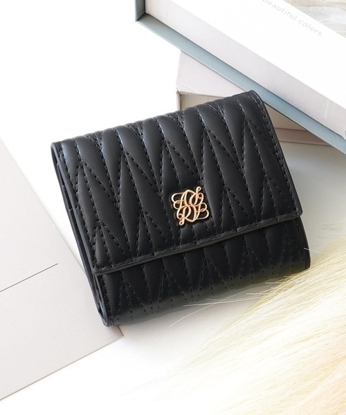 キルティング素材とゴールドのモチーフが上品な、ALTROSEの「モチーフ三つ折財布」。サイズは約9(横)×10(高さ)×2.5(マチ)cm、重さは約88g。片手に収まるミニサイズのため、小さいバッグに入れて持ち運びたい人におすすめです。