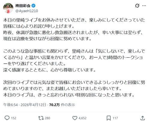 「本日の里崎ライブをお休みさせていただき、楽しみにしてくださっていた皆様には心よりお詫び申し上げます」と書き出し、12日に開催された元ロッテの里崎智也氏(49=日刊スポーツ評論家)のイベント欠席を報告。その上で「昨夜、体調が急激に悪化し救急搬送されましたが、幸い大事には至らず、現在は治療を受けながら回復に努めています」と伝えた。