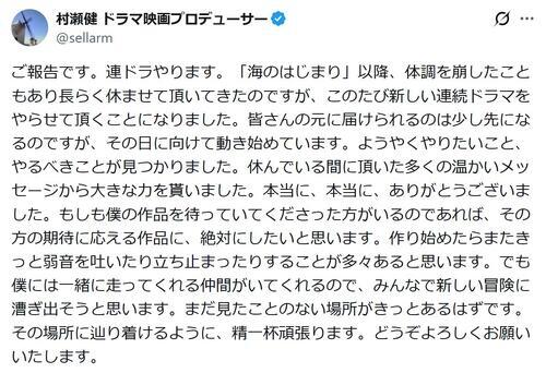Snow Man目黒蓮(29)が出演し話題を呼んだ22年10月期のフジテレビドラマ「silent」などをてがけたフジテレビの村瀬健プロデューサー(52)が13日までにXを更新。体調不良から再起し、新しい連続ドラマの制作を始めたと明かした。