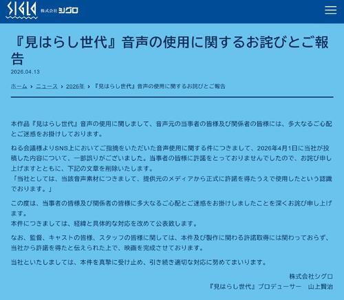 25年10月10日に公開された映画「見はらし世代」(団塚唯我監督)を製作した株式会社シグロは13日、公式サイトに「『見はらし世代』音声の使用に関するお詫びとご報告」と題し、山上賢治プロデューサー名の文書を発表。「この度は、当事者の皆様及び関係者の皆様に多大なるご心配とご迷惑をお掛けしましたことを深くお詫び申し上げます」と謝罪した上で「本件につきましては、経緯と具体的な対応を改めて公表致します」と謝罪とともに今後の対応を、改めて発表するとした。