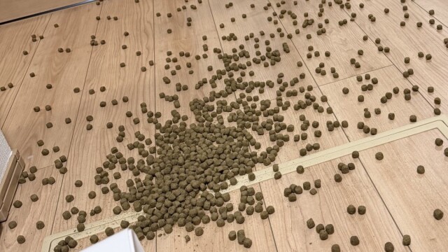 写真を見ると、家の床にペットフードが大量に散乱しています! 飼い主さんがうっかりこぼしてしまったのか、それともエマちゃんが何かいたずらでもしたのでしょうか……?