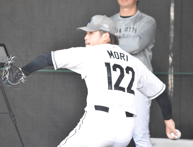 ロッテ・森遼大朗(撮影=岩下雄太) ロッテの育成・森遼大朗は、支配下選手再復帰を目指し、腕を振っている。