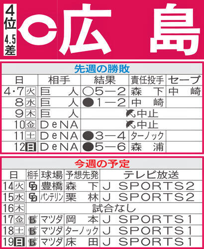 <今週の見どころ>今週は無敗と未勝利の2カードとなる。まず開幕カードで3連勝した中日と2連戦。リベンジに燃える相手を返り討ちにしたいところだ。週末は先週末にいずれも逆転負けで2連敗を喫したばかりのDeNAとの再戦となる。カード初戦に先発する岡本駿投手(23)をのぞき、フレディ・ターノック(27)と床田寛樹(31)にとっては前回登板のリベンジマッチとなる。