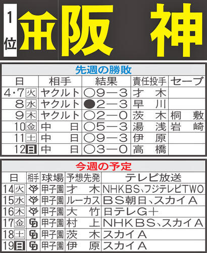 <今週の見どころ>今季初の甲子園6連戦が始まる。巨人3連戦と中日3連戦。リーグ優勝した昨季は同球場で37勝25敗、貯金12を作った。今季もここまで2勝1敗と勝ち越し。引き続き地の利を生かせるか。週半ばは悪天候も予想されるため、リードを保ったままの試合展開が望ましい。阪神園芸の「神整備」にも注目だ。