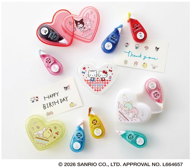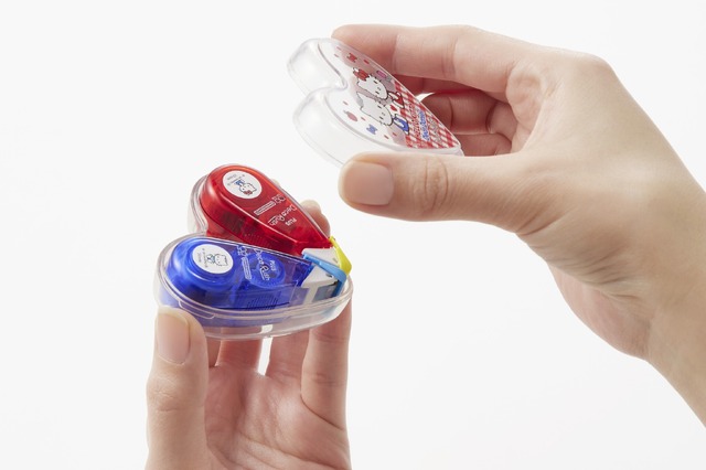 「デコラッシュ」の形状をいかし、ぴったり2個収納できるハート型のケースに、ハローキティやマイメロディ、シナモロールなどを、ペアごとに描いた限定デザインを採用。「デコラッシュ」のテープ幅6mmと10mmの両タイプが入り、積み重ね収納も可能。「デコラッシュ」だけでなく、クリップや付箋など、ちょっとした身のまわりの小物収納もできるのが嬉しい。