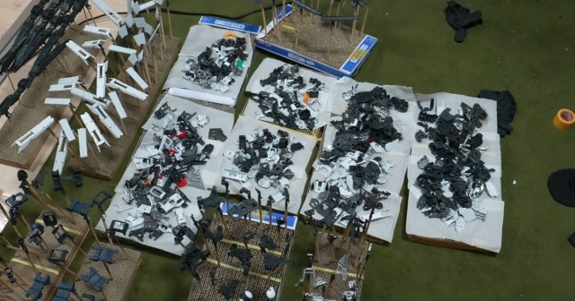 部品数があまりにも多いため、乾燥ブースに入りきらず、塗装時に使う支持棒も全く足りない状態。しかし、塗装ブースからダクトを引っ張ってきて風を当てたり、クリスマスツリーのごとく1本の支持棒に何個ものパーツを刺したりと、工夫を凝らして対処していきます。