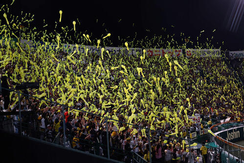 7回表の攻撃終了後、すでに場内は風船で真っ黄色だったが、ルールにのっとり、スタジアムDJは「ジェット風船を膨らませて下さい」とアナウンス。運営側や選手も気持ちよく試合を盛り上げたい意向で、観客もその気持ちはあるものの、一方では早く風船を膨らませたい思いもあるのだろう。7回表終了後に風船を膨らませることを定着させるには、まだ時間がかかりそうだ。