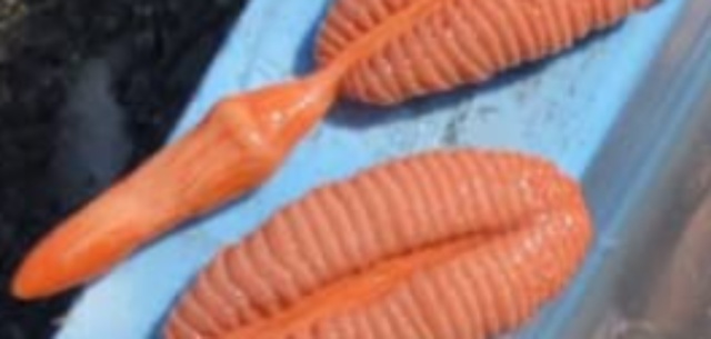 水揚げされたのは、全身オレンジ色の“なにか”! アワビの身から棒が生えたような形をしており、ヒヒダがびっしりと並んでいます。かろうじて生き物とは分かりますが、「それ工業用品の部品だよ」と言われれば信じてしまうかもしれません。いったいこの生物は何者?