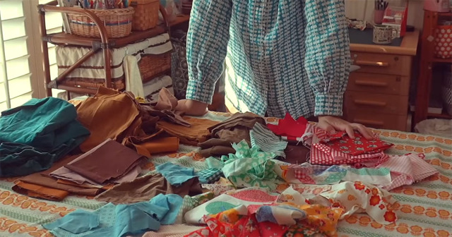 裏地が形になったところで、いよいよ主役となるパッチワークの制作へ。まちこさんの前には、これまでの服作りで生まれた膨大な“ハギレの山”が広がります。