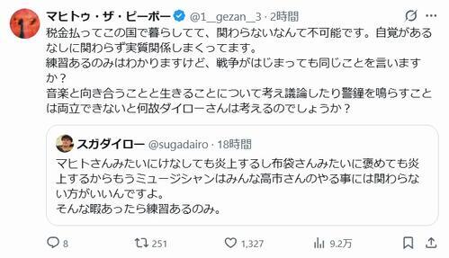 マヒトゥ・ザ・ピーポーは「税金払ってこの国で暮らしてて、関わらないなんて不可能です。自覚があるなしに関わらず実質関係しまくってます」とミュージシャンが政治と関わるのは、むしろ当たり前のことだと訴えた。「練習あるのみはわかりますけど、戦争がはじまっても同じことを言いますか? 音楽と向き合うことと生きることについて考え議論したり警鐘を鳴らすことは両立できないと何故ダイローさんは考えるのでしょうか?」と疑問を投げかけた。