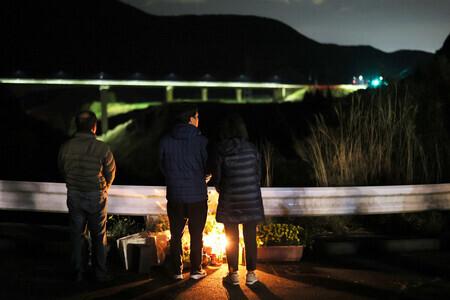 旧阿蘇大橋の崩落現場付近で、亡くなった大和晃さんを追悼する母忍さん(右)ら。奥は新阿蘇大橋=16日未明、熊本県南阿蘇村 熊本県阿蘇市の大和忍さん(58)は、熊本地震の本震で大学生だった次男、晃さん=当時(22)=を失った。あれから10年、「当時のことを思わない日はない」といい、今年も本震が起きた16日に合わせ、現場で祈りをささげた。