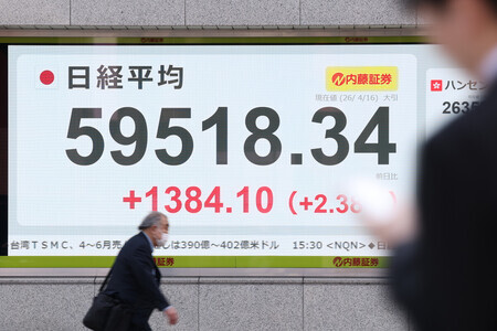 史上最高値の5万9518円で取引を終えた日経平均株価の終値を示すモニター=16日午後、東京都中央区 16日の東京株式市場で、日経平均株価の終値は前日比1384円10銭高の5万9518円34銭と大幅に続伸した。米国とイランの和平協議進展への期待を背景に買いが入り、日経平均は米イスラエルとイランの開戦直前の2月27日に記録した過去最高値を約1カ月半ぶりに更新した。