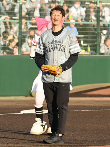 セレモニアルピッチは「九州スポーツキッズキャラバン」のアンバサダーを務める球団統括本部付アドバイザー和田毅氏(45)と同学年の元サッカー日本代表の巻誠一郎氏(45)が行った。2人ともノーバウンド投球を披露した。巻氏は「和田さんにアドバイスしてもらった。ホークスはダイエー時代から応援している大好きなチーム」と話した。
