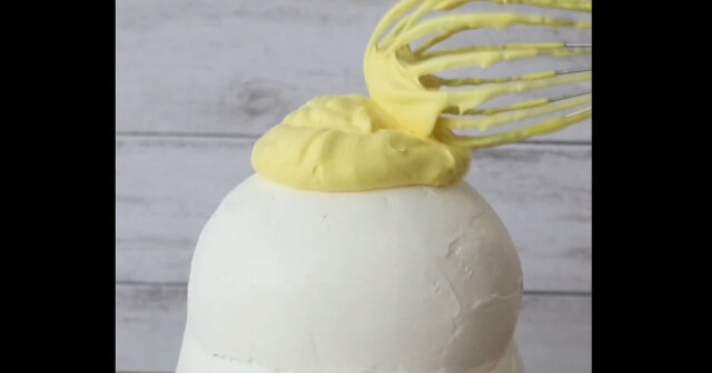 今回話題を呼んだ手作りケーキの動画では、最初は雪だるまや鏡餅のような白くてまるいフォルムから始まります。そこにやさしい色合いの黄色のクリームをのせたら……?