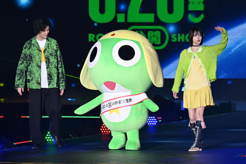 粗品は、慣れないファッション&音楽イベントの出演とあって「緊張してます。普段やらないから。半年ぶりぐらいにメークしたんですから」と、少し照れながら話しつつ映画をPR。あのはその後も「うれしかったし光栄」などと話し、最後まで“ケロロ愛”が止まらなかった。