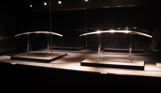 (左から)重要文化財「太刀 銘□忠(薄緑・膝丸)」京都・大覚寺蔵[通期展示]、重要文化財「太刀 国綱ト銘ガアル(鬼切丸・髭切)」京都・北野天満宮蔵(通期展示) (C)ORICON NewS inc. 京都国立博物館で6月14日まで特別展『北野天神』が開催されている。源氏の重宝で“兄弟刀”とも呼ばれる「髭切」(北野天満宮蔵)と「膝丸」(大覚寺蔵)の2振が同じケース内に展示され、撮影可能となっていることに反響が寄せられている。