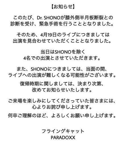 また、SHONO自身も17日、Xで「サッカーやってないのにサッカー選手みたいな怪我しました 早く復帰できるように治療に専念します ライブ前なのにすみません ドラム叩けなくてつまんない」と公表した。