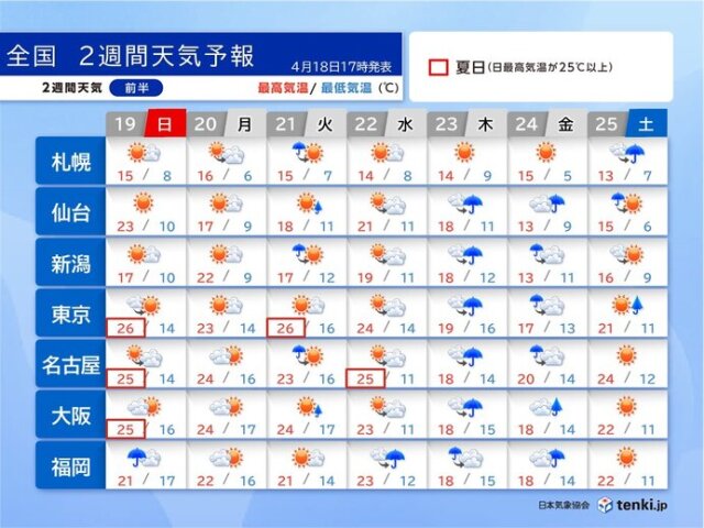 22日(水)頃にかけて平年よりも気温が高くなる所が多く、東京、名古屋、大阪では最高気温が25℃以上の夏日になる日があるでしょう。汗ばむ暑さとなる所では、日傘や帽子で暑さを避けたり、こまめに水分をとるなど熱中症対策を心がけてください。23日(木)から25日(土)は、季節先取りの暑さは落ち着く見込みです。