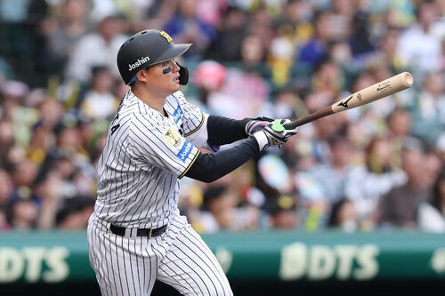 1点を追ったこの回。1死一塁で、この日出場選手登録された中日の新戦力、杉浦稔大投手(34)のフォークを捉えて右中間フェンス直撃の適時二塁打。一塁走者の中野拓夢内野手(29)が好スタートを切っており、同点のホームを陥れた。