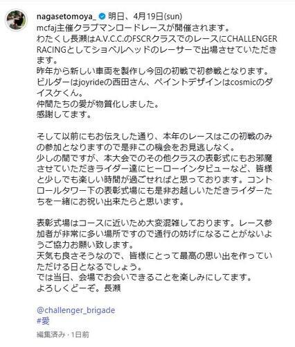 長瀬は18日の投稿で、19日に茨城県・筑波サーキットで開催されるMCFAJ主催クラブマンロードレースに「A.V.C.C.のFSCRクラスでのレースにCHALLENGER RACINGとしてショベルヘッドのレーサーで出場させていただきます」と報告。「本年のレースはこの初戦のみの参加となりますので是非この機会をお見逃しなく。少しの間ですが、本大会でのその他クラスの表彰式にもお邪魔させていただきライダー達にヒーローインタビューなど、皆様と少しでも楽しい時間が過ごせればと思っております。コントロールタワー下の表彰式場にも是非お越しいただきライダーたちを一緒にお祝い出来たらと思います」とつづっていた。