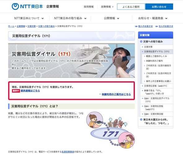 災害用伝言ダイヤル(171)は、地震など大規模災害発生時に電話がつながりにくくなった場合に、家族や知人の安否を確認できる“声の伝言板”。「171」をダイヤルし、ガイダンスに従って利用する。