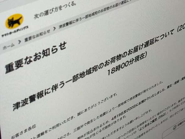 (出典:ヤマト運輸のWebサイト) 4月20日の午後4時53分ごろに三陸沖で発生した震度5強の地震と津波警報により、宅配便に配送遅延が生じる可能性が高まっている。ヤマト運輸と佐川急便が自社Webサイトなどで状況を説明し、利用者に理解を求めた。