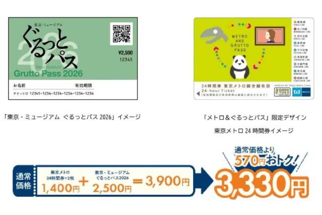 東京メトロ24時間券2枚と「東京・ミュージアム ぐるっとパス2026」をセットにした企画乗車券。「東京・ミュージアム ぐるっとパス2026」は、東京を中心とする美術館・博物館などの入場券・割引券がセットになったもの。