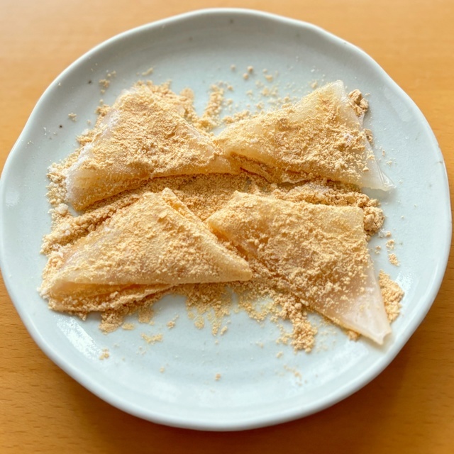 本物のわらび餅のようなとろりとした粘り気はありませんが、その分しっかりとした弾力があり、もちもちとした食感を楽しめます。