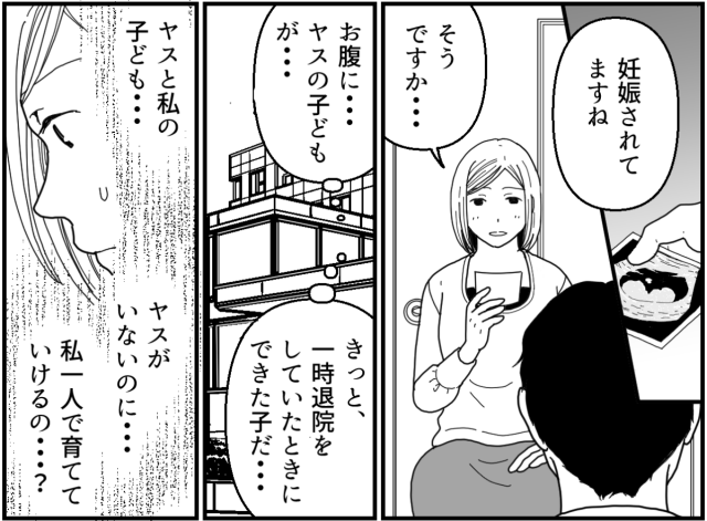 急いでトイレに駆け込んで吐くと、親戚たちがザワついていました。「気の毒に」「そりゃ仕方ないわよ」「ヤスくんが亡くなって間もないものね」そんな声が聞こえてきます。ヒナちゃんと叔母さんが心配して駆け寄ってきました。