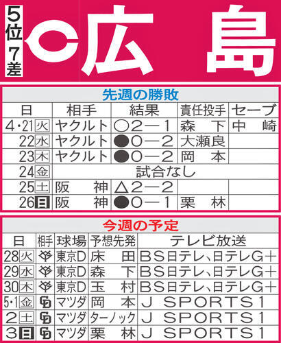 <今週の見どころ>開幕2週目から4週連続で1勝止まりとなっている。カード勝ち越しは3連勝した開幕カードを最後に一度もない。28日から9連戦で追い上げムードをつくるためにも連勝したいところ。ここまで2人で1勝の床田寛樹投手(31)。森下暢仁投手(28)が9連戦の最初と最後を任せられる2枚看板に奮投が期待される。
