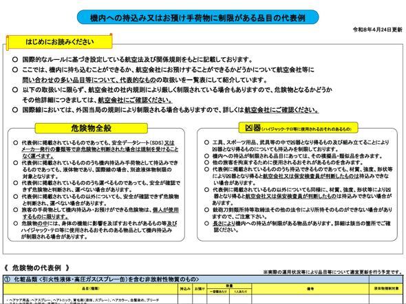 今回の変更は、国土交通省航空局が4月24日付で「機内への持込み又はお預け手荷物に制限がある品目の代表例」を更新したことによるもの。