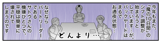 GWのシフト調整が始まると、サトウさんは「親の介護」を理由に休暇を宣言しました。サトウさんは普段、パートリーダーとして私たちパートの配置を指示しています。レジやカウンター対応、商品の品出しにバックヤードでの仕事など……。そしてGW期間、自分は出勤しないくせに「勝手に変更することは許さない」と言ったのです。